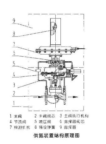 供氮装置结构如右图所示,将设在罐顶的取压点的介质经导压管引入检测机构(7)、介质在检测元件上产生一个作用力与弹簧(8)、预紧力相平衡。当罐内压力降低至低于供氮装置压力设定点时,平衡被破坏,使指挥器阀芯(6)打开,从而使阀前气体经减压阀(5)、节流阀(4)、进入主阀执行机构(3)上、下膜室,打主开阀阀芯(2)、向罐内充注氮气;当罐内压力升至供氮装置压力设定点时,由于预设弹簧力,关闭指挥器阀芯(6)又由于主阀执行机构中弹簧作用,关闭主阀,停止供氮。